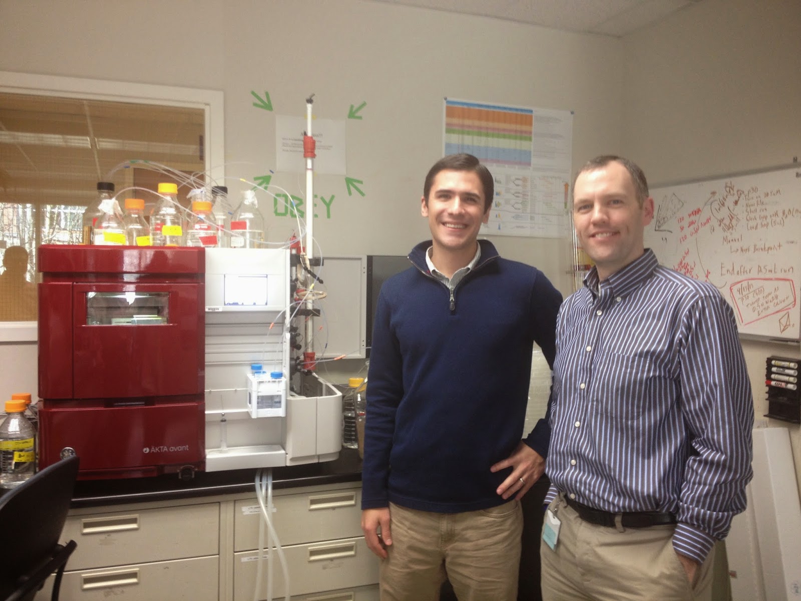 | Collin and Drew hard at work with another important piece of equipment funded by cancer parents in order to manufacture these proteins. |